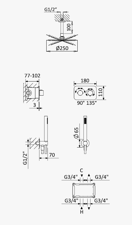 Bruma Venus Zestaw natryskowy termostatyczny podtynkowy z deszczownicą sufitową Ø 250 mm i słuchawką prysznicową Chrom 1845606CR