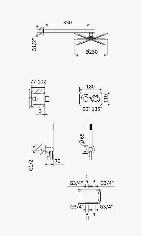 Bruma Venus Zestaw natryskowy termostatyczny podtynkowy z deszczownicą ścienną Ø 250 mm i słuchawką prysznicową Chrom 1847803CR