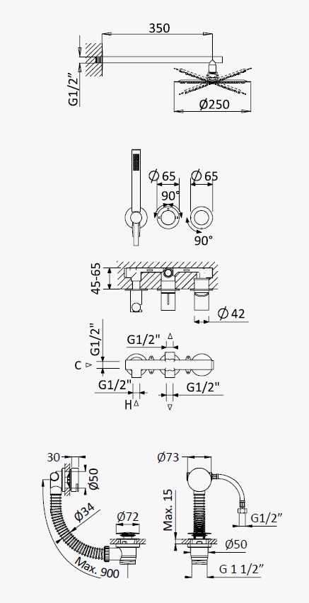Bateria wannowo-natryskowa podtynkowa z deszczownicą ścienna, napełniacz w przelewie