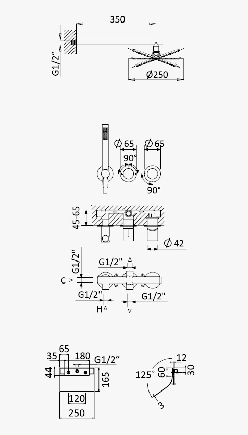 Bateria wannowo-natryskowa podtynkowa z deszczownicą ścienną, wylewką kaskadową,