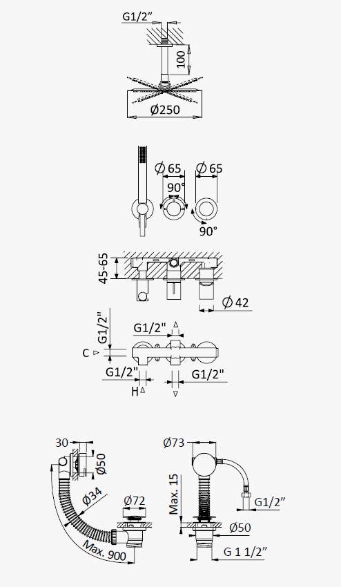 Bruma Avalon Bateria wannowo-natryskowa podtynkowa z deszczownicą ścienną Ø 250 mm napełnianiem przez przelew i słuchawką prysznicową Chrom 1893521CR