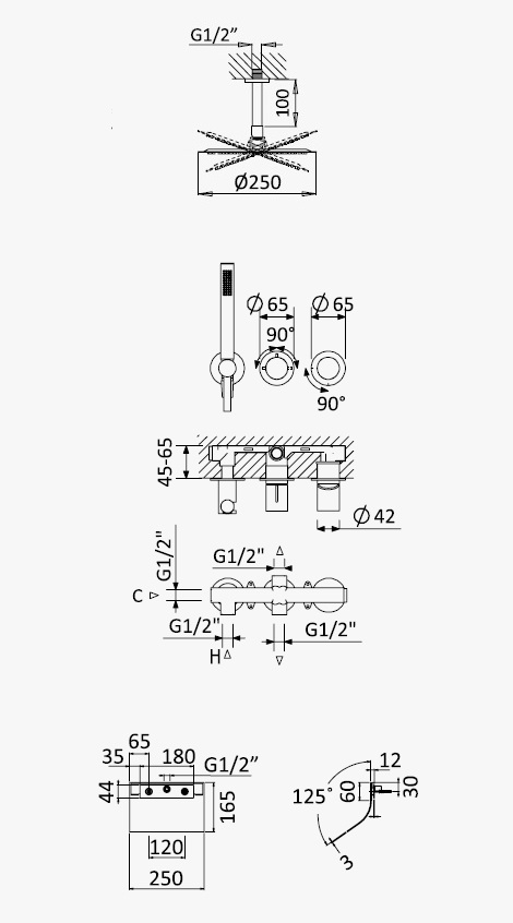 Bruma Avalon Bateria wannowo-natryskowa podtynkowa z deszczownicą sufitową Ø 250 mm wylewką i słuchawką prysznicową Chrom 1893651CR