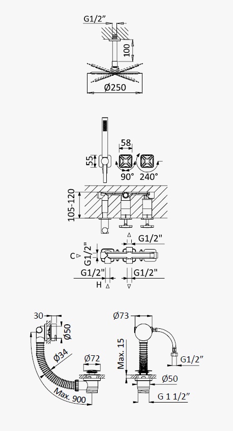 Bruma Navy Bateria wannowo-natryskowa podtynkowa z deszczownicą sufitową Ø 250 mm z zestawem natryskowym i napełnianiem przez przelew Chrom 1903621CR