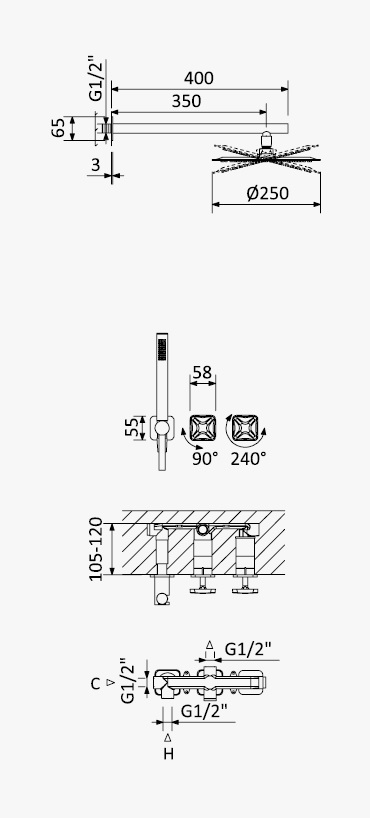 Bateria natryskowa z deszczownicą ścienną i słuchawką, uchwytem z przyłączem kątowym