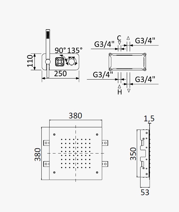 Bruma Navy Zestaw natryskowy termostatyczny z deszczownicą sufitową 380x380 mm i słuchawką prysznicową Chrom 1907861CR
