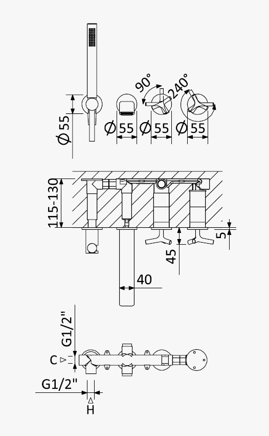 Bateria wannowo-natryskowa ze słuchawką oraz przyłączem z uchwytem