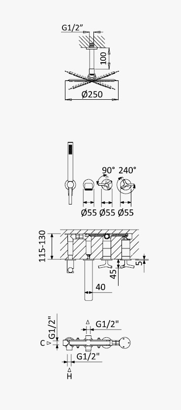 Bateria termostatyczna wannowo-natryskowa podtynkowa, z deszczownicą i zestawem natryskowym: słuchawka, wąż i przyłącze z uchwytem
