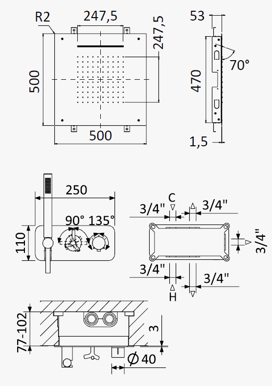 Bruma Genesi Zestaw prysznicowy podtynkowy termostatyczny z deszczownicą sufitową 500x500mm ze strumieniem kaskadowym i słuchawką prysznicową Chrom 1917881CR