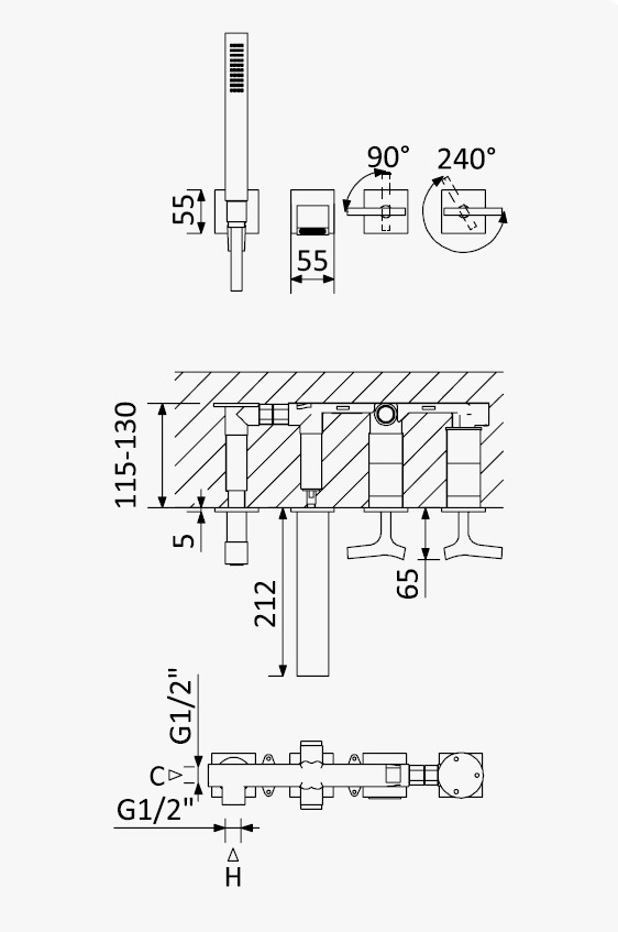 Bateria wannowo-natryskowa podtynkowa z wylewką i słuchawką prysznicową oraz przyłączem z uchwytem