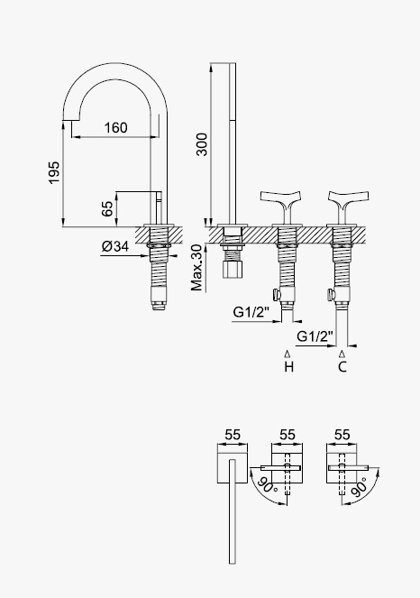 Bruma Royale Bateria umywalkowa 3-otworowa bez korka Chrom 1922601CR
