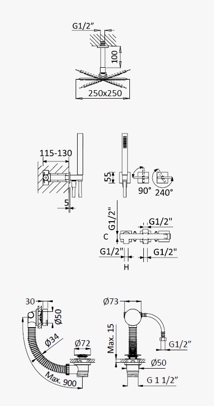 Bruma Royale Bateria wannowo-natryskowa podtynkowa z deszczownicą sufitową 250x250 mm i zestawem natryskowym oraz napełnianiem przez przelew Chrom 1923621CR