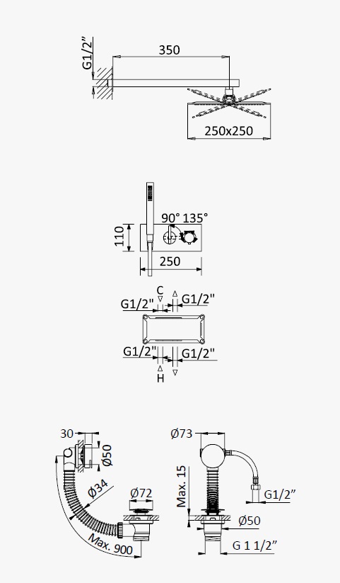 Bruma Royale Bateria termostatyczna wannowo-natryskowa podtynkowa z deszczownicą ścienną 250x250 mm i zestawem natryskowym oraz napełnianiem przez przelew Chrom 1925021CR