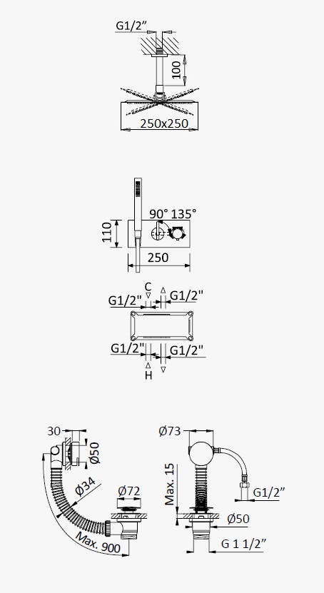 Bruma Royale Bateria termostatyczna wannowo-natryskowa podtynkowa z deszczownicą sufitową 250x250 mm i zestawem natryskowym oraz napełnianiem przez przelew Chrom 1925121CR