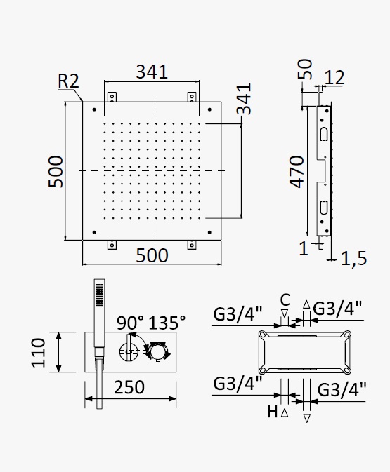 Bruma Royale Zestaw termostatyczny natryskowy podtynkowy z deszczownicą montowaną w sufit 500x500 mm i słuchawką prysznicową Chrom 1927871CR
