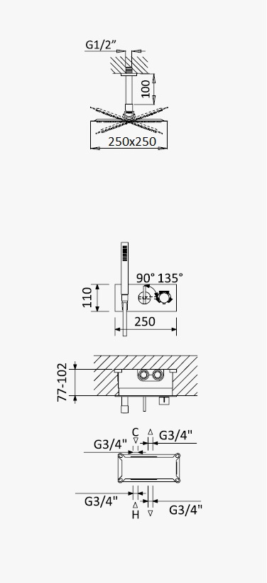 Bruma Royale Zestaw termostatyczny natryskowy podtynkowy z deszczownicą sufitową 250x250 mm i słuchawką prysznicową Chrom 1927921CR