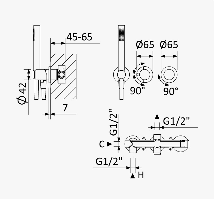 Bateria natryskowa podtynkowa z zestawem: uchwyt ścienny z przyłączem, wąż i słuchawką