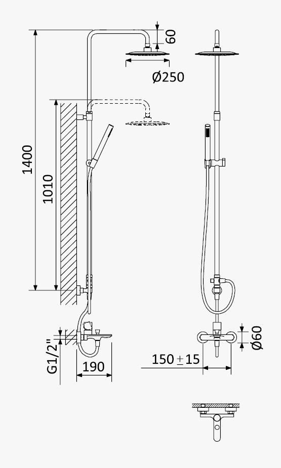 Bateria ścienna o regulowanej wysokości deszczownicy