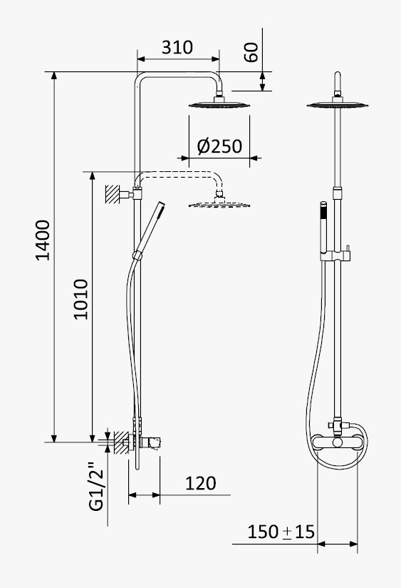 Bateria ścienna o regulowanej wysokości deszczownicy
