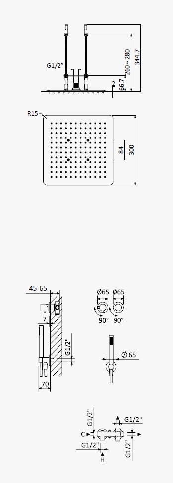 Bruma Adagio Bateria podtynkowa natryskowa z deszczownicą 300x300 mm w suficie i słuchawką prysznicową Chrom 1934211CR