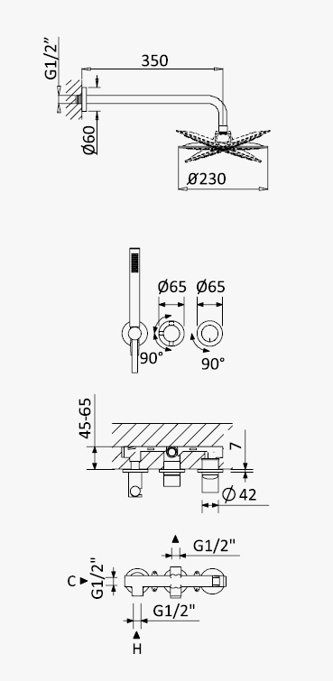 Bateria podtynkowa natryskowa z deszczownicą ścienną i słuchawką prysznicową oraz przyłączem z uchwytem