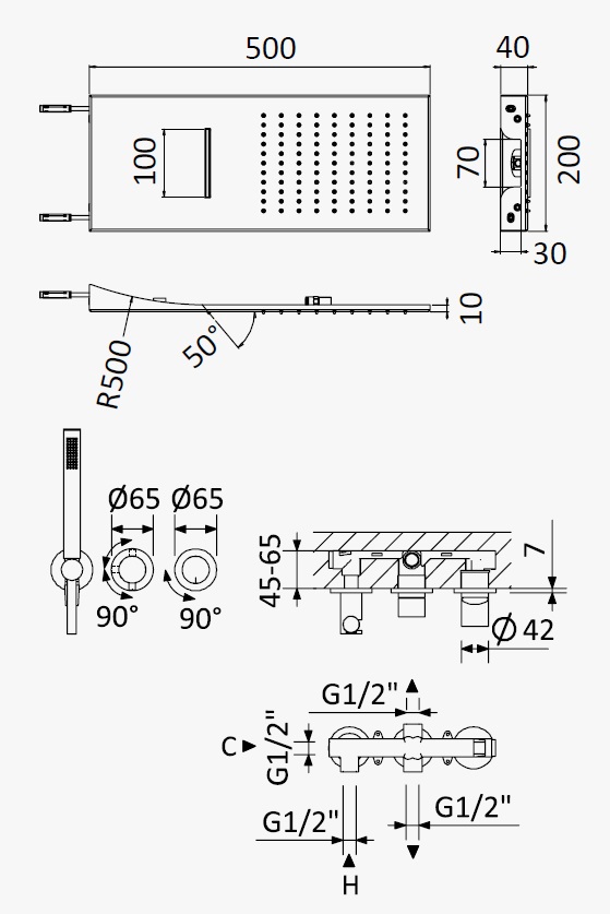 Bateria podtynkowa natryskowa z deszczownicą ścienną z funkcją strumienia kaskadowego i słuchawką prysznicową oraz przyłączem z uchwytem