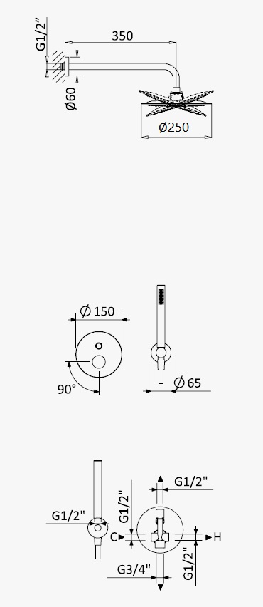 Bateria podtynkowa natryskowa z deszczownicą ścienną i słuchawką prysznicową oraz przyłączem z uchwytem