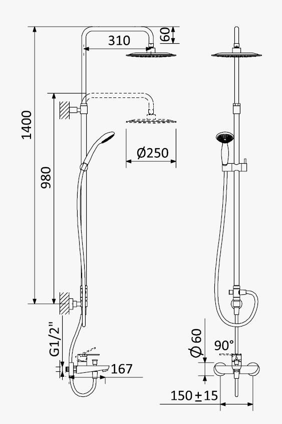 Bateria wannowo-natryskowa z deszczownicą na ruchomym drążku