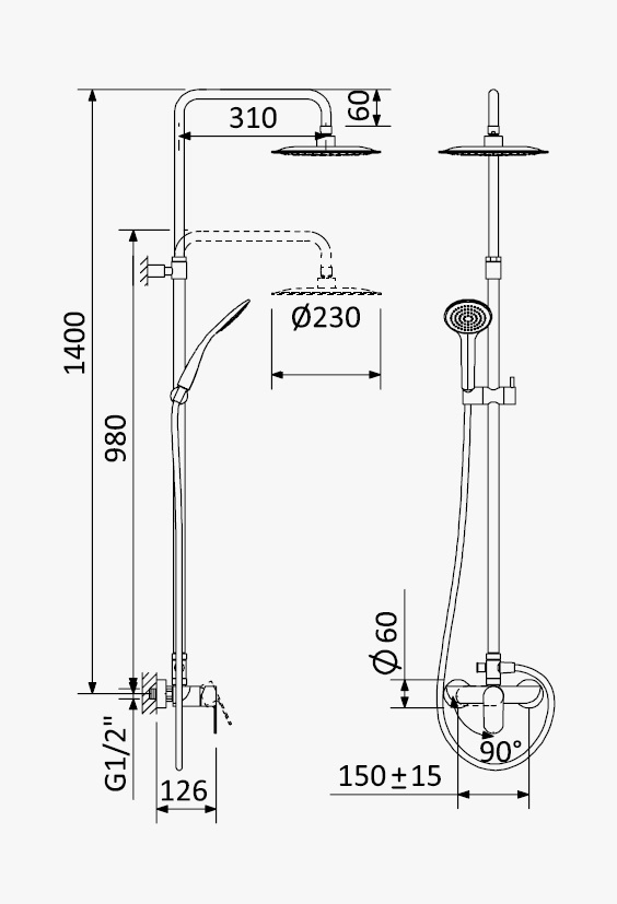 Bateria natryskowa z deszczownicą na ruchomym drążku