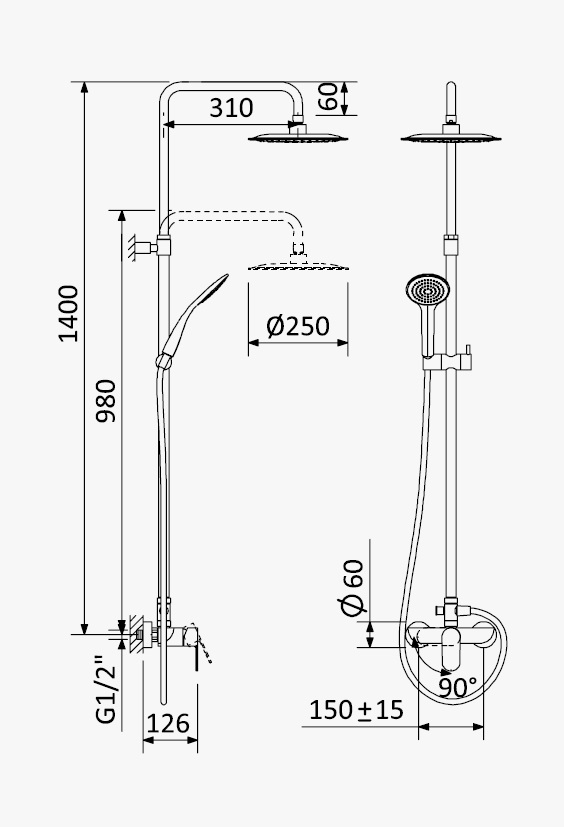 Bateria natryskowa z deszczownicą na ruchomym drążku