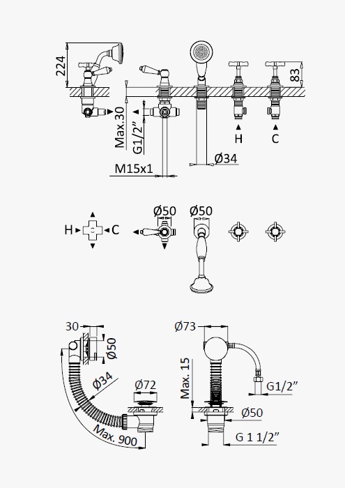Bruma Imperial Zestaw wannowo-natryskowy 4- otworowy ze słuchawką prysznicową i napełniaczem w przelewie Chrom 1175211CR