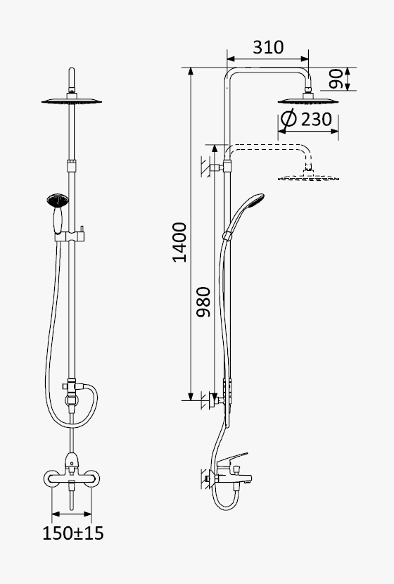 Bateria wannowo-natryskowa ścienna z deszczownicą na drążku ściennym wysuwanym, ze słuchawką prysznicową na uchwycie suwanym