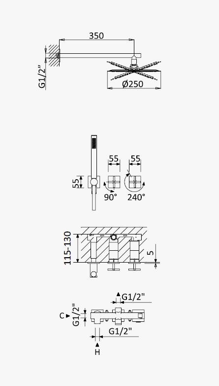 Bateria natryskowa podtynkowa z deszczownicą ścienną, ze słuchawką i uchwytem z przyłączem