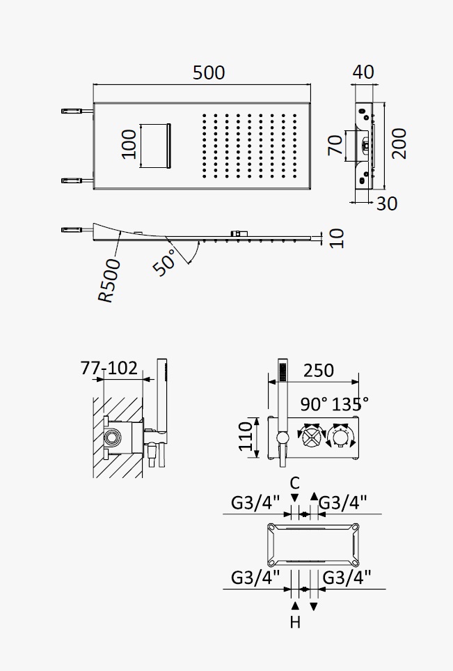 Bateria natryskowa podtynkowa termostatyczna, z deszczownicą ścienną ze strumieniem kaskadowym , ze słuchawką prysznicową i przyłączem z uchwytem