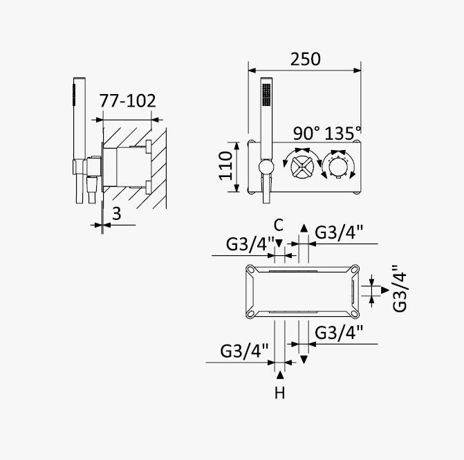 Bateria natryskowa termostatyczna podtynkowa 3-drożna ze słuchawką prysznicową