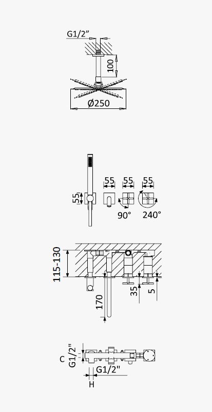 Bateria wannowo-natryskowa podtynkowa z deszczownicą sufitową, z wylewką i słuchawką przysznicową oraz uchwytem z przyłączem