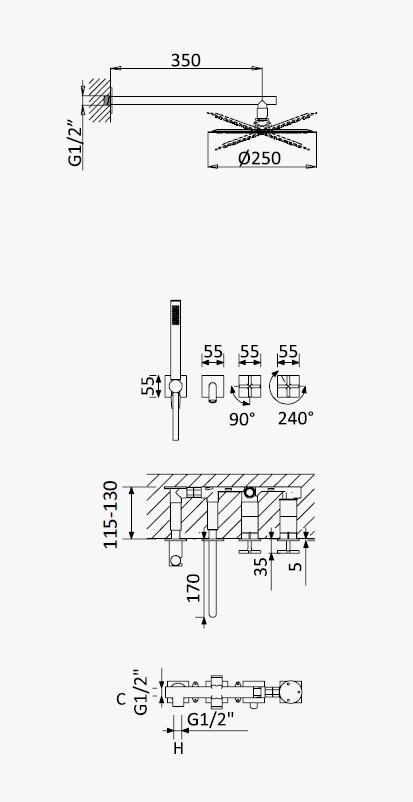 Bateria wannowo-natryskowa podtynkowa z deszczownicą ścienną, z wylewką i słuchawką przysznicową oraz uchwytem z przyłączem