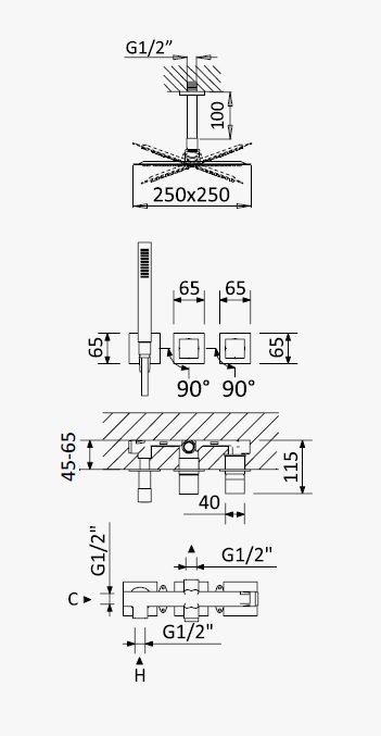 Bruma Escudo 2 Zestaw natryskowy podtynkowy z deszczownicą 250x250 mm sufitową Chrom 1025801CR