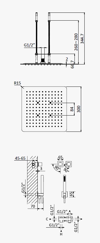 Bateria natryskowa podtynkowa z deszczownicą kwadratową montowaną w suficie i słuchawką prysznicową oraz przyłączem kątowym z uchwytem