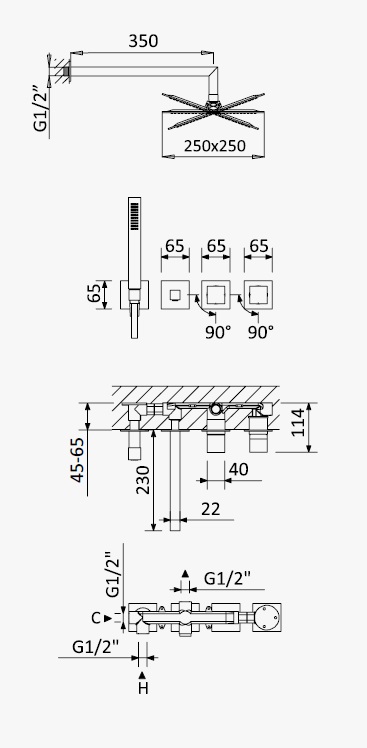 Bateria natryskowa podtynkowa z deszczownicą ścienną i słuchawką prysznicową oraz przyłączem kątowym, z wylewką