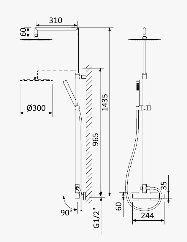 Zestaw natryskowy z deszczownicą, regulowanym ramieniem, baterią i słuchawką.