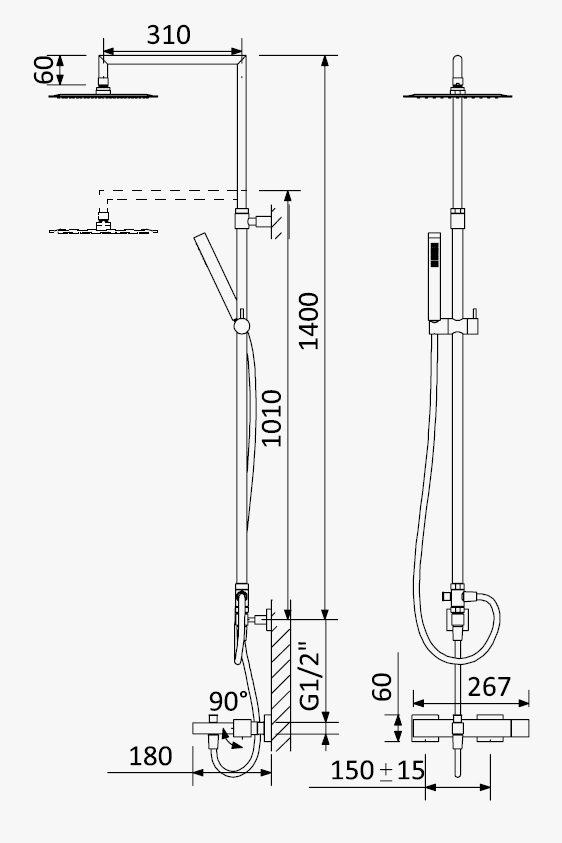 Zestaw wannowo-natryskowy z deszczownicą, regulowanym ramieniem, baterią i słuchawką.