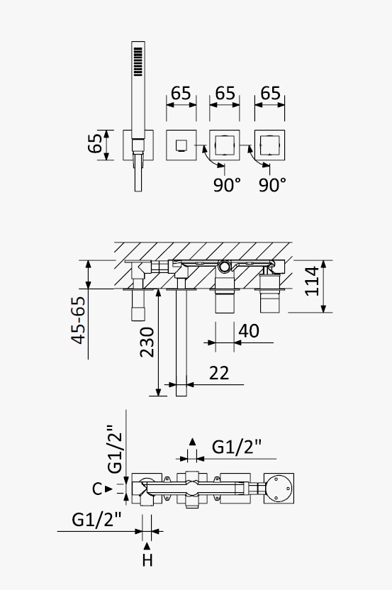 Bateria podtynkowa wannowa z wylewką i słuchawką prysznicową z uchwytem i przyłączem kątowym