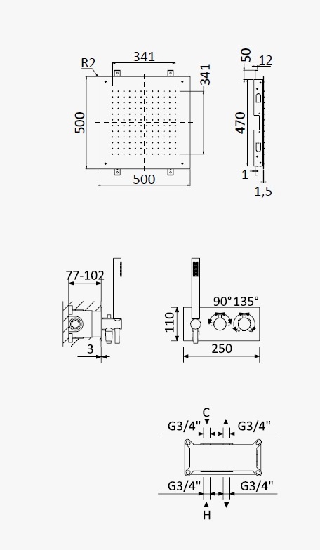 Bruma Elo Zestaw natryskowy podtynkowy z deszczownicą 500x500 mm sufitową oraz ze słuchawką prysznicową Chrom 1384221CR