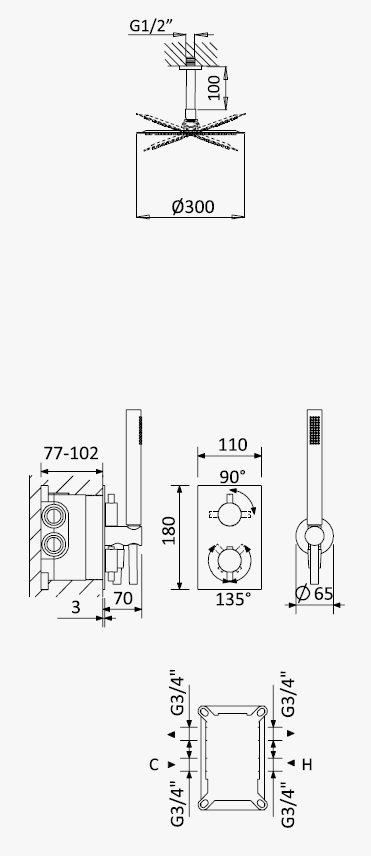 Bruma Elo Zestaw natryskowy termostatyczny z deszczownicą Ø 300 mm sufitową ze słuchawką prysznicową Chrom 1385606CR