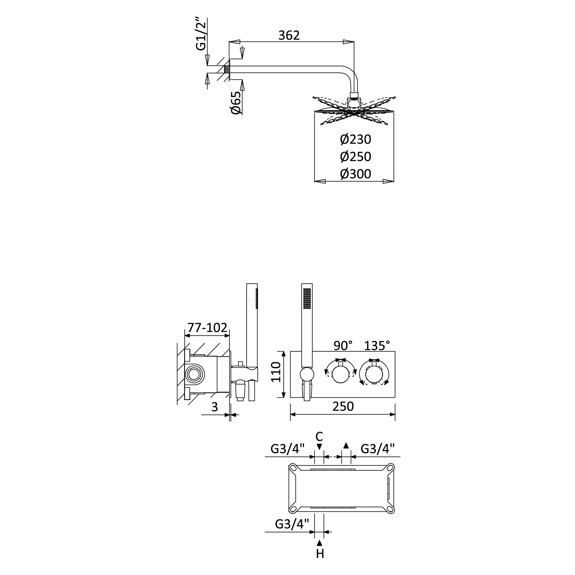 Szerokość rozety: 250 mm