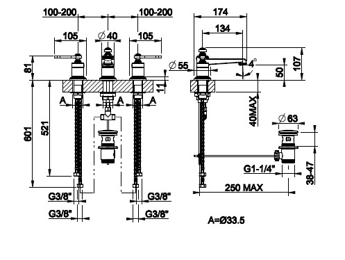 Gessi Venti20 Bateria umywalkowa 3-otworowa z korkiem niska chrom 65011.031