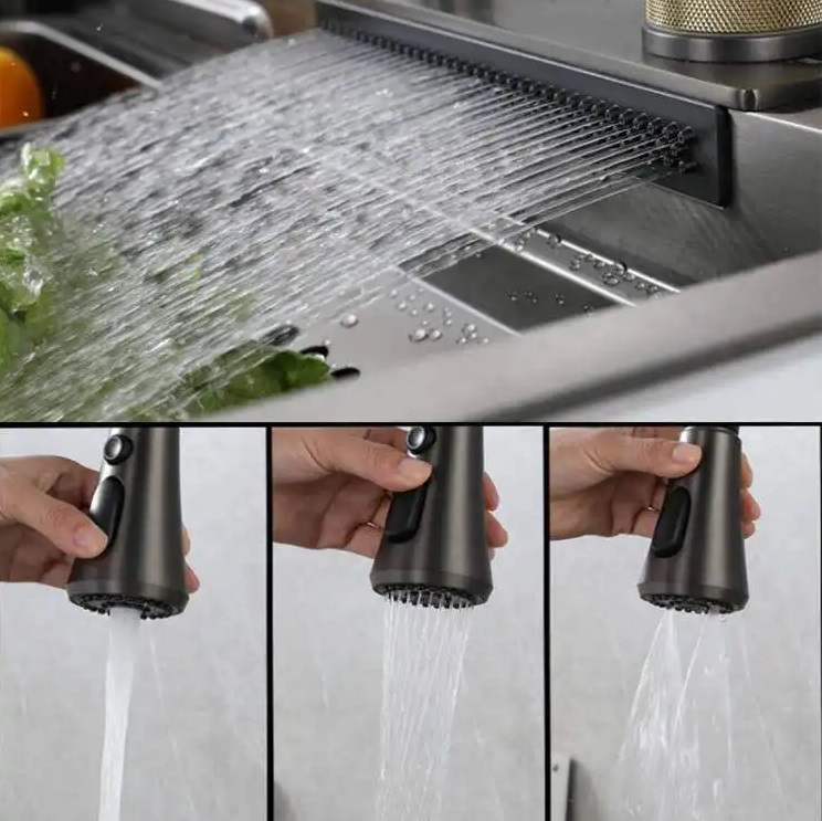 • Kran z wyciąganą wylewką z 3 rodzajami strumienia wody