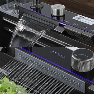 5 klawiszy Innowacyjna konstrukcja z ikonami na przyciskach do niezależnego sterowania kaskadą, myjką szklanek, głównym kranem, wodospadem i kranem wody uzdatnionej. Możesz dowolnie przełączać się między tymi pięcioma opcjami. |