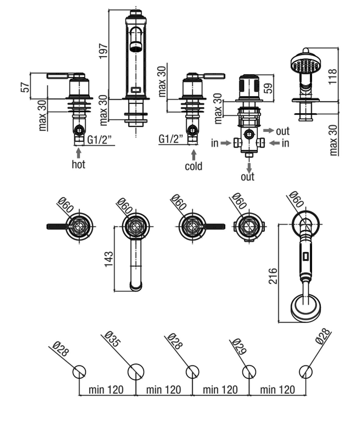 Rozstaw: 12 cm, 12 cm, 12 cm, 12 cm
