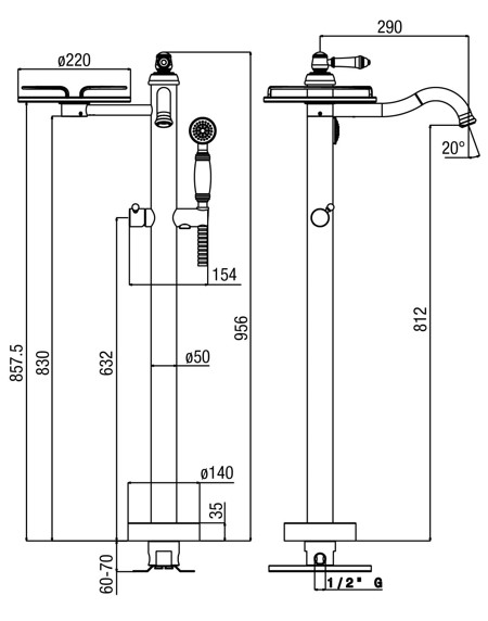 Alpi London Bateria wannowo-natryskowa wolnostojąca z zestawem prysznicowym i półką chrom LO411804CR
